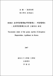 연구 결과에 따라 한국산 호리비단벌레속의 종검색표를 작성하였고 종별 형태적 특징, 문헌기록, 채집지와 생물학적 정보 등을 체계적으로 정리, 수록하였다.|To clarify taxonomy of the genus Agrilus (Coleoptera: Buprestidae: Agrilinae) in Korea, this study was conducted.
