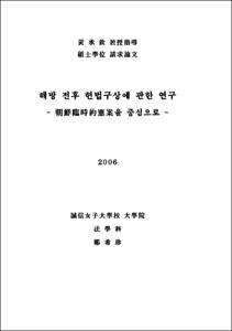 - 이 논문은 해방 전 후 헌법구상을 분석하고 제헌헌법과의 관계를 밝히는 것을 목적으로 하였다. 이를 위하여 대한민국임시정부의 임시헌법과 건국강령, 미․소공위의 임시정부 운영 정책 및 헌장 작성을 위한 자문서의 답신안, 미군정 산하 입법기구인 남조선과도입법의원이 작성한 약헌안 등의 배경과 내용을 분석하여 해방 전 후 헌법구상의 의의와 한계를 확인하였고 제헌헌법 제정 과정에 미친 영향을 연구하여 제헌헌법과의 관계를 고찰하였다.